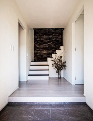 玄関ホールから見た階段。その先にどんな空間が広がるのか、來訪者の想像力をかき立てます
