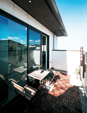 リビングの隣に設けた奧行きのあるバルコニー。青空の下でティータイムを楽しむこともできます