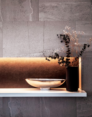 キッチン背面に設けたニッチ。間接照明がオブジェを美術品のように照らします