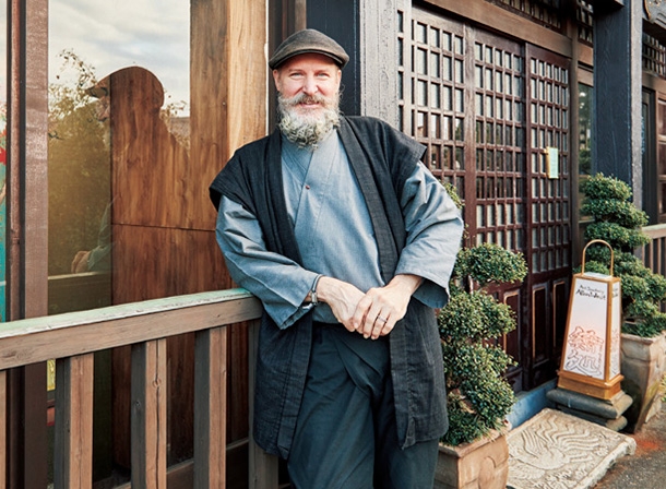 アトリエ兼ギャラリー前に立つアランさん。玄関にはお寺の門の一部を移築