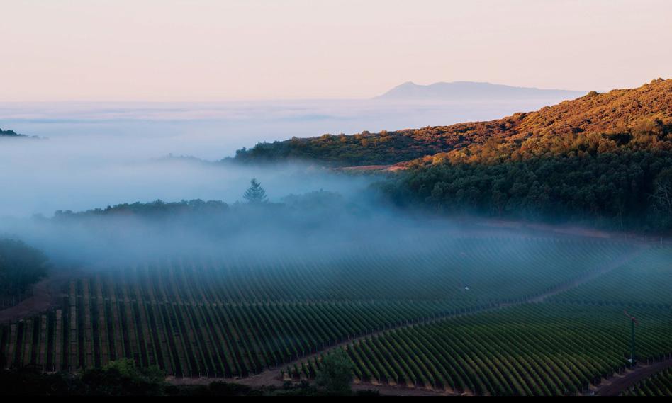 ブドウの木が整然と並ぶ畑の姿は、まるで天が授けたじゅうたんのよう。夜明けとともに漆黒の闇が薄らいでくると、緑色のじゅうたんの上を白い朝霧が覆います。それは果実にとって恵みとなる朝露をもたらし、大地を潤していくのです。これほど神秘的で美しいブドウ畑が、20年前には荒野だったと誰が想像できるでしょうか。