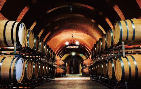 ワイナリーの深部に並ぶオーク樽。樽の中でワインは香りや味わいを深めます