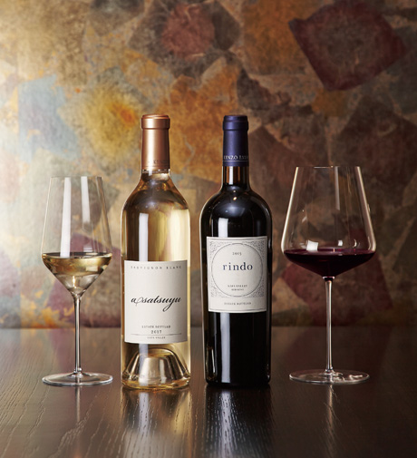 ケンゾー エステイトのフラッグシップとなるボルドーブレンドの赤ワイン「紫鈴」(右)と、數々の受賞歴を誇るソーヴィニヨン?ブランを用いた白ワインの名品「あさつゆ」(左)