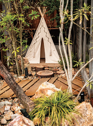 小さなテントは見た目も楽しいだけでなく、子どもたちの秘密基地にぴったり。切り株風(fēng)のステッピングストーン(飛び石)で足元をアレンジ