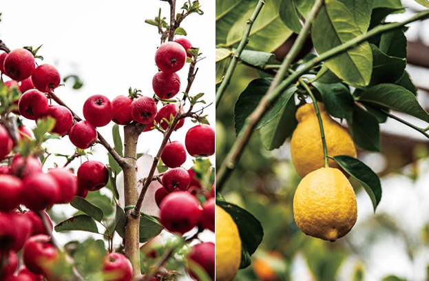鮮やかな彩りを庭にもたらすリンゴとレモンの木