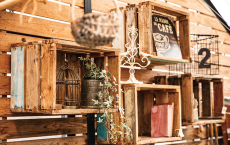 ワインの木箱などを壁に掛けてアンティークな小物とともにグリーンを飾る方法も