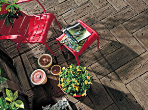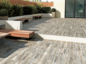 古材のようなテイストの磁器素材を用いれば、溫もりのあるデッキに