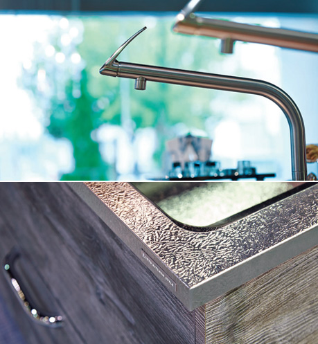 下:ワークトップだけでなくシンクの內側まで施されたアイス柄は、無作為に削られたような凹凸が魅力