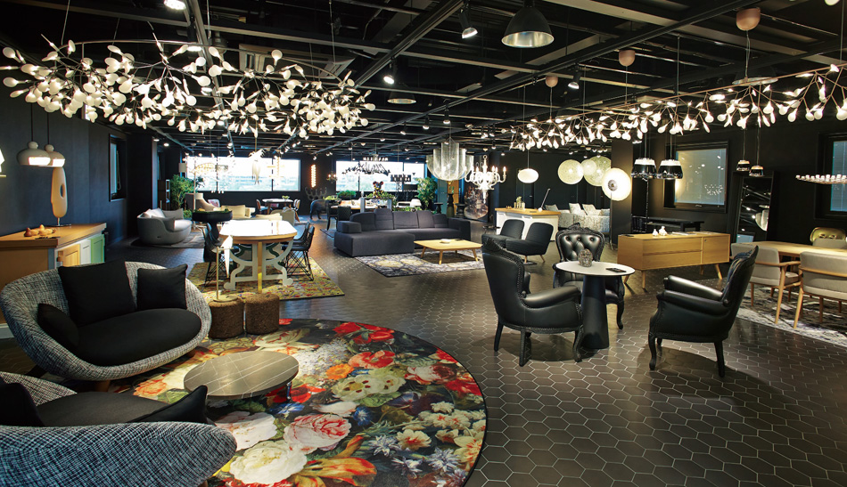 左:斬新なデザインで注目されているオランダのインテリアブランド「モーイ」。寫真のシャンデリアは、ワイヤーを使った意外性あふれる逸品