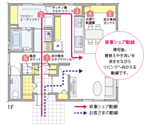 ポイントは、子どもを含めた家族の一人ひとりが、自分の身の回りの家事を自分でできるようにすることです。例えば、外から帰ってきたら上著をハンガーにかけ、鞄を所定の位置にしまい、手洗いや著替えをしてからリビングに向かう“家事シェア動線”。リビングに家族の持ち物が散らかるのを防いで、「散らかったものを片づける」という「名もなき家事」を発生させません。