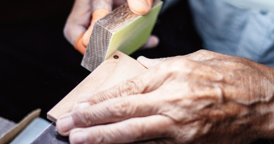 手に取ると滑らかな觸り心地は、地道な磨き上げの作業によるもの。サンドペーパーややすりを使って面を滑らかにし、丁寧に仕上げます。自らのセンスをフル稼働させて質を高める、職人の腕の見せ所です。この工程の後、塗裝が施され、検品を経て商品として店頭に並びます。