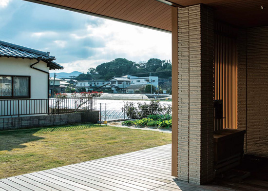 右:軒先とウッドデッキがつくる平行線は絶妙の美しさ。遠くには緑豊かな山の姿を望みます