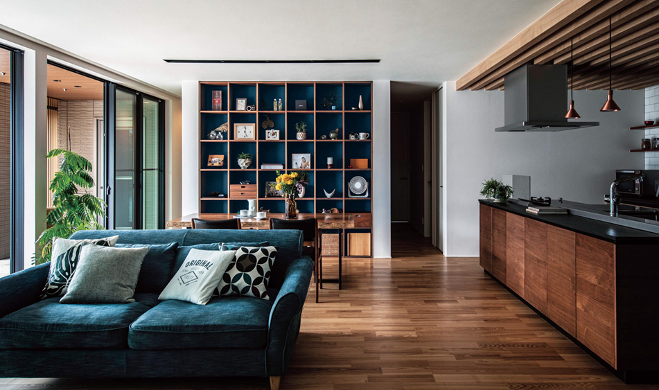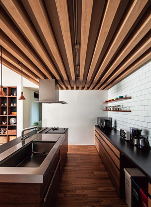 ショールームでひとめぼれしたアイランドキッチンは、背面にタイルの壁や見せる収納を設けて、里依子さんのイメージ通りに。天井のルーバーは、照明器具の位置を自由に変えられるダクトレールを隠すとともに、空間のアクセントになっています。