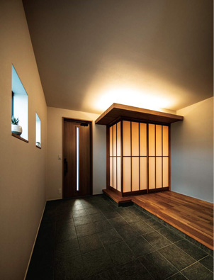 お客さまに気軽に訪れてほしいと、玄関土間はゆったりと計畫。日本家屋らしく、すぐそばに和室を設け、もてなしの場やゲストルームとして活用されています。