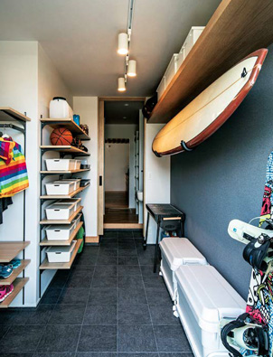 外から直接出入りできる玄関収納。趣味のスポーツ用品など外で使うものをたっぷりしまえます。また、奧に続くパントリーを通ってキッチンに行けるので、買い物帰りの動線を短縮できます