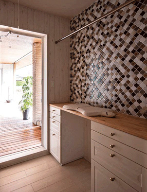 ユーティリティにはお気に入りのタイルを張って、快適に家事ができるよう工夫。サービステラスに直接つながり、洗濯物干しにも便利です