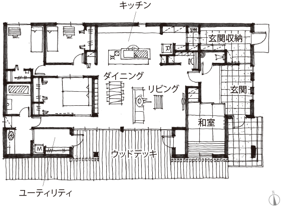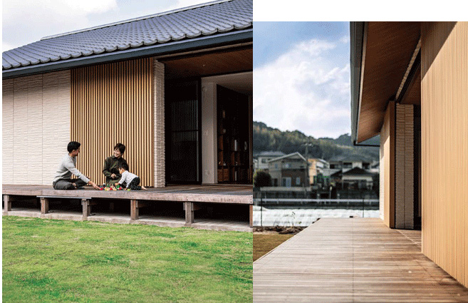 深い軒の下に広がる「縁側」のようなウッドデッキは、リビングと段差なくつながって生活の場の一部に。食事を取る時や、長男の翔一くん(1歳)を遊ばせる時など、自然と外に出るのが日常的なのだそう。あえて敷地境界に塀を立てていないため、ご近所の方がふらりと訪れて話しかけてくれます。