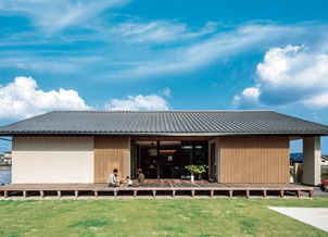 転勤で地元に戻ったのをきっかけに、家を建てたい、田舎暮らしを楽しみたいという夢を実現されたFさま。海からほど近い場所に100坪以上の土地を求め、外と內をつなげて生活できる平屋を建築されました。