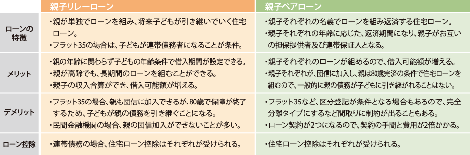 二世帯住宅の住宅ローンとしては「親子リレーローン」と「親子ペアローン」が代表的です。「親子リレーローン」は親が借り入れて、同居する子どもがその債務を受け継ぎます。一般の住宅ローンに設定されている親の完済時の年齢制限(80歳まで)がなく、子どもが連帯債務者になります。