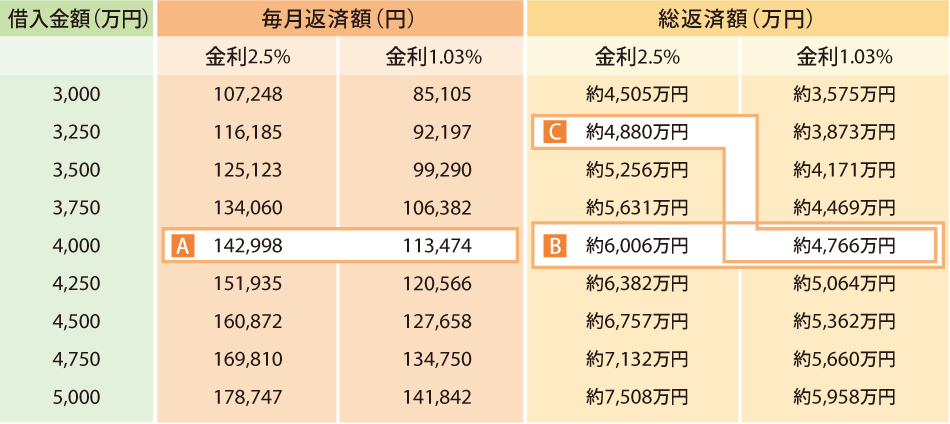 金利が変われば毎月返済額と総返済額が大きく変わります。たとえば4,000萬円を35年返済(月々返済のみ)で借りた場合の毎月返済額は、金利が2.5%なら142,998円、金利が1.03%なら113,474円(A)。その差は29,524円、年間で354,288円です。35年間の総返済額を比較すると、約6,006萬円と約4,766萬円で、差は約1,240萬円にもなります(B)。また、金利2.5%で3,250萬円借り入れた場合と、金利1.03%で4,000萬円借り入れた場合を比べると、後者の方が借入額が750萬円も増えているのに総返済額は少なくなります(C)。