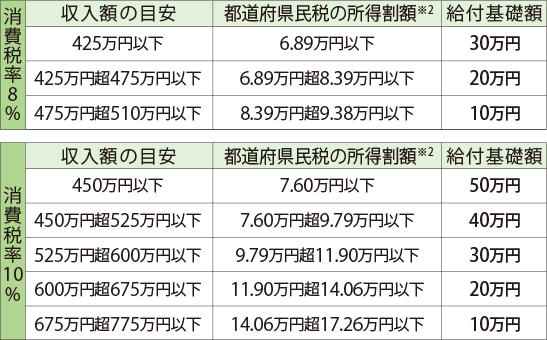 - ※3:10%時には、収入額の目安が650萬円以下(都道府県民稅の所得割額が13.30萬円以下)の要件が追加されます