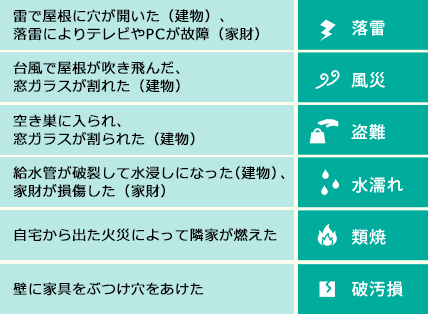 - 火災、落雷、破裂?爆発、風災?ひょう災?雪災