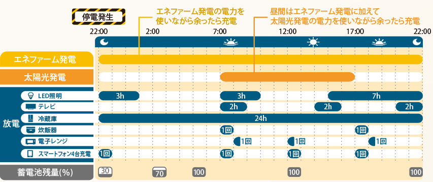 停電発生時に蓄電池の殘量が30%であっても、エネファーム発電と太陽光発電を組み合わせ、5.4kWh蓄電池を活用することで普段に近い生活が可能です。効率的な電力運用が災害時以外も続き、日々の光熱費を大幅に削減できます。